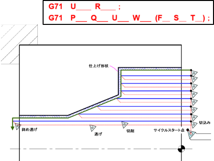 (2)外径・内径粗加工の複合固定サイクルプログラム