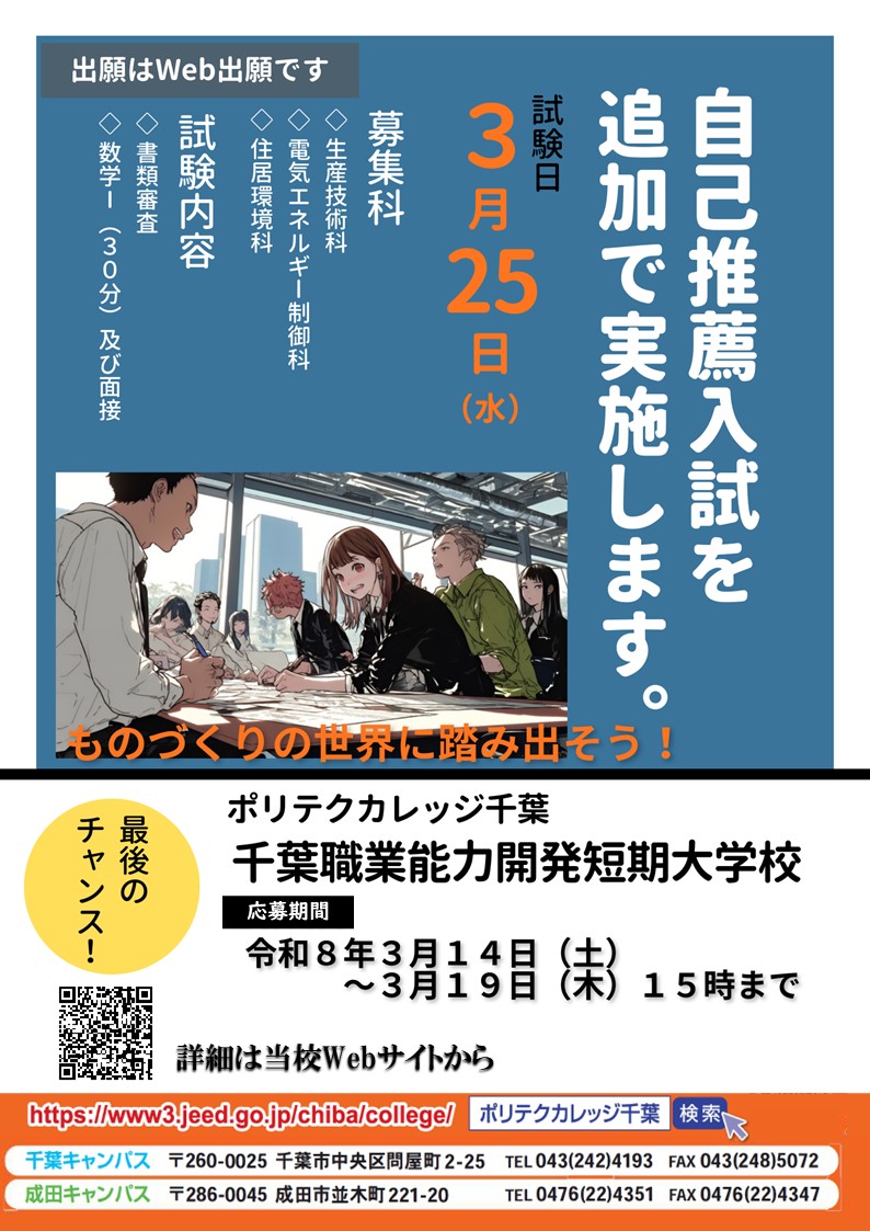 【令和8年度入校生募集】自己推薦入試を追加で実施します!(応募期間3/14~3/19)