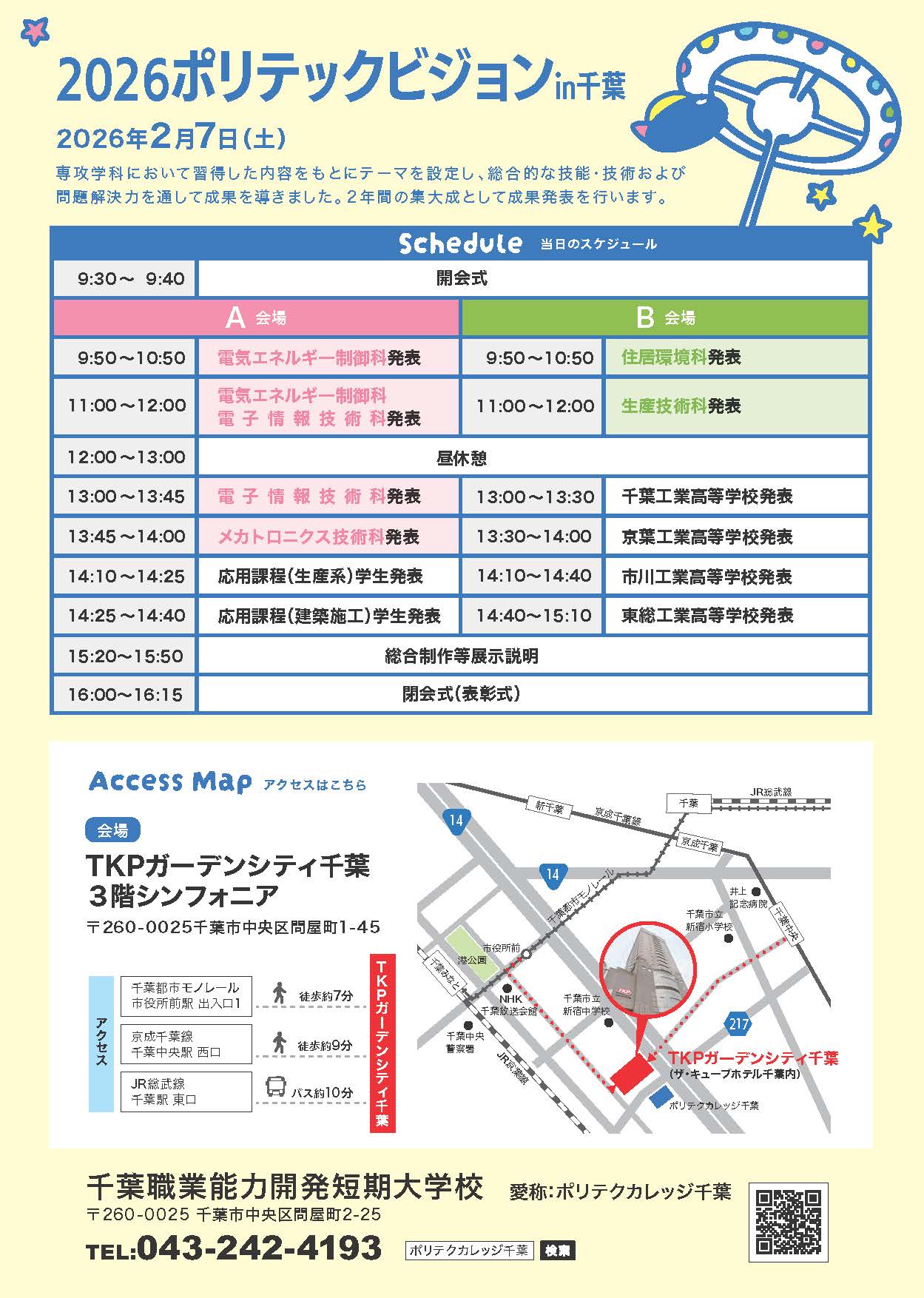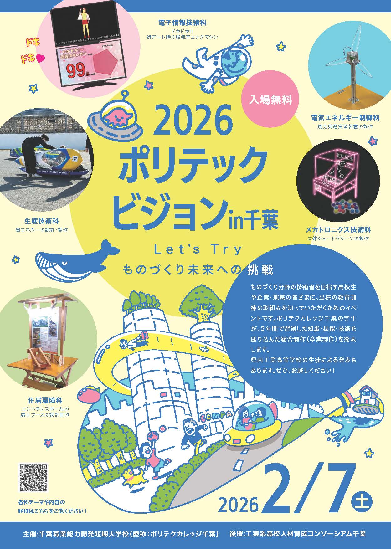 ポリテックビジョン ポリテックビジョンとは、企業や地域の皆さまに、当校が取り組む教育訓練の取組みを知っていただくためのイベントです。ポリテクカレッジ千葉の学生が、2年間で習得した知識・技能・技術を盛り込んだ総合制作(卒業制作)を発表します。県内の工業高等学校生徒の課題発表も行います。皆様のご来場をお待ちしております。 2026ポリテックビジョンin千葉開催概要 2026ポリテックビジョンin千葉のテーマは、「Let's Try ものづくり未来への挑戦」です。 各科テーマと内容の詳細について 現在、準備中です。