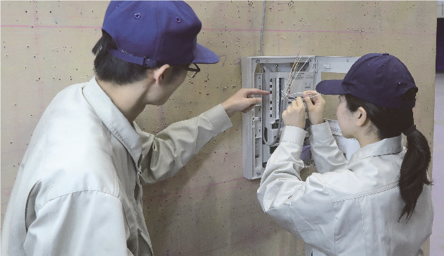 P型1級受信機、感知器、発信機、ベルの取付と配線作業を通して、自動火災報知設備についての施工方法と点検作業を習得します。