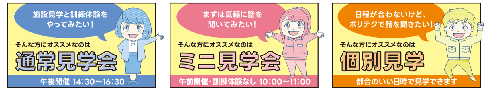ポリテクセンター福井では、3種類の見学会をご用意しています。