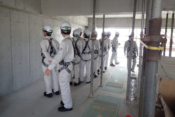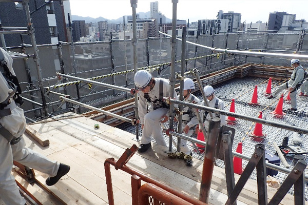 現場では、大学校で学んだ安全衛生の知識を活かして、フルハーネスやヘルメットをしっかり装着。1年生とは思えないほどスムーズな準備で、現場の方々にも安心していただけたようです。