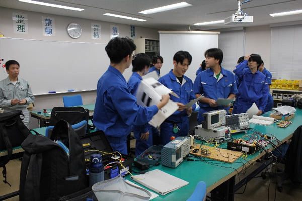 測定をするには、電圧計や電流計などの計測器があります。当校は約7割の学生が普通科高校からの入校者であり、初めて見る・触る計測器がありますが、計測器の特徴や使い方など実習を通して理解を深めることにより、ものづくりにおける実践力を育成していきます。