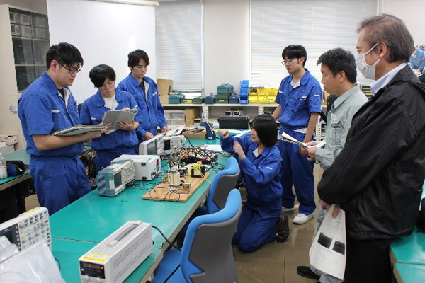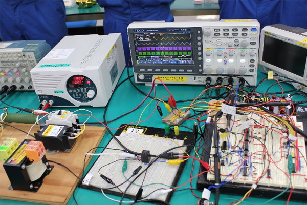 標準課題Ⅰとは生産電気システム技術科1年生(4年生大学の3年生に相当)の後期10月から約3か月掛けて取り組む課題です。10単位(180時間)掛けて、1グループ5名の学生で設計、製作していきます。パワーコンディショナとは、太陽電池で発電した電気(直流)をコンセントの電気(交流)に接続するための装置で、これにより電気を売ること(売電)ができます。技術要素としては、アナログ・デジタル電子回路技術、パワーエレクトロニクス技術、マイコン制御技術、実装技術等、多くの知識を必要とします。12月初旬までに完成させるため、学生は日夜取り組んでいます。ここでは、途中経過をお披露目するDR(デザインレビュー)の様子をお届けします。