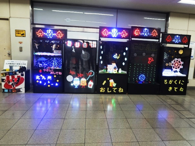 そのモノレールの平和通駅にイルミネーションの展示を行っています。10月28日から11月27日まで駅北口、11月28日から2026年2月11日まで場所を駅南口改札前に移して展示しています。このイルミネーションは、九州職業能力開発大学校電子情報技術科2年生が総合課題実習として取り組んだもので、イルミネーション全体の装飾はもちろん、光の点滅や光に合わせて音を奏でるための電子回路やパターンプログラム等を制作しました。