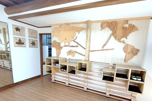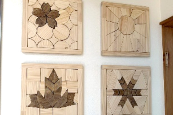 今回、玄関入り口の看板と壁掛けパズルを制作しました。看板はサクラ・スギ・ヒノキの3種類の木材を用い、厚みを変えて組み合わせることで立体感を持たせています。パズルは幾何学と四季をモチーフにし、壁に掛けられるデザインとすることで、インテリアとしても楽しめるようにしました。