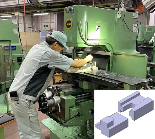 フライス作業における効率化・高精度加工化をめざして、条件設定や加工法の検討・段取りの方法を、技能検定2級相当の課題を題材とした加工実習を通して習得します。