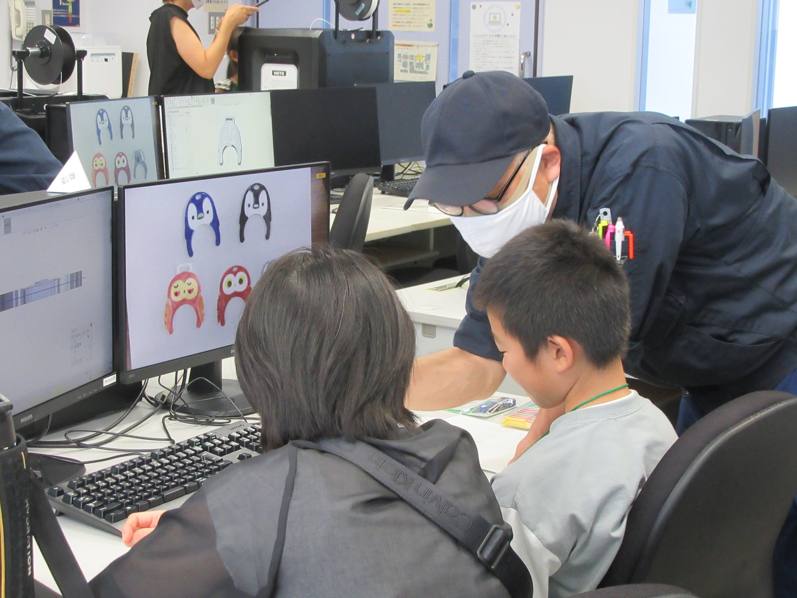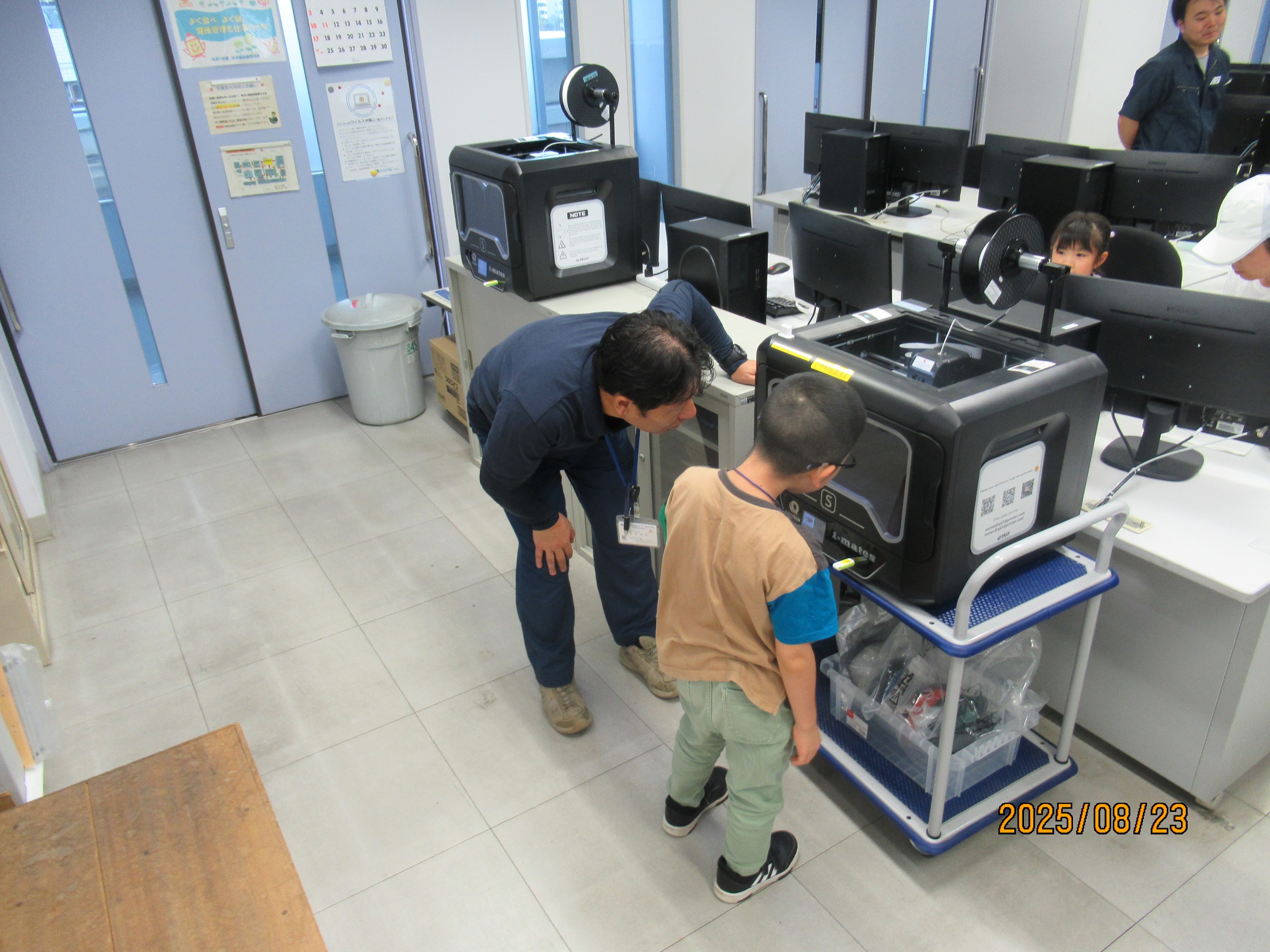 3Dプリンターを覗き込んで出来上がりを待っています。