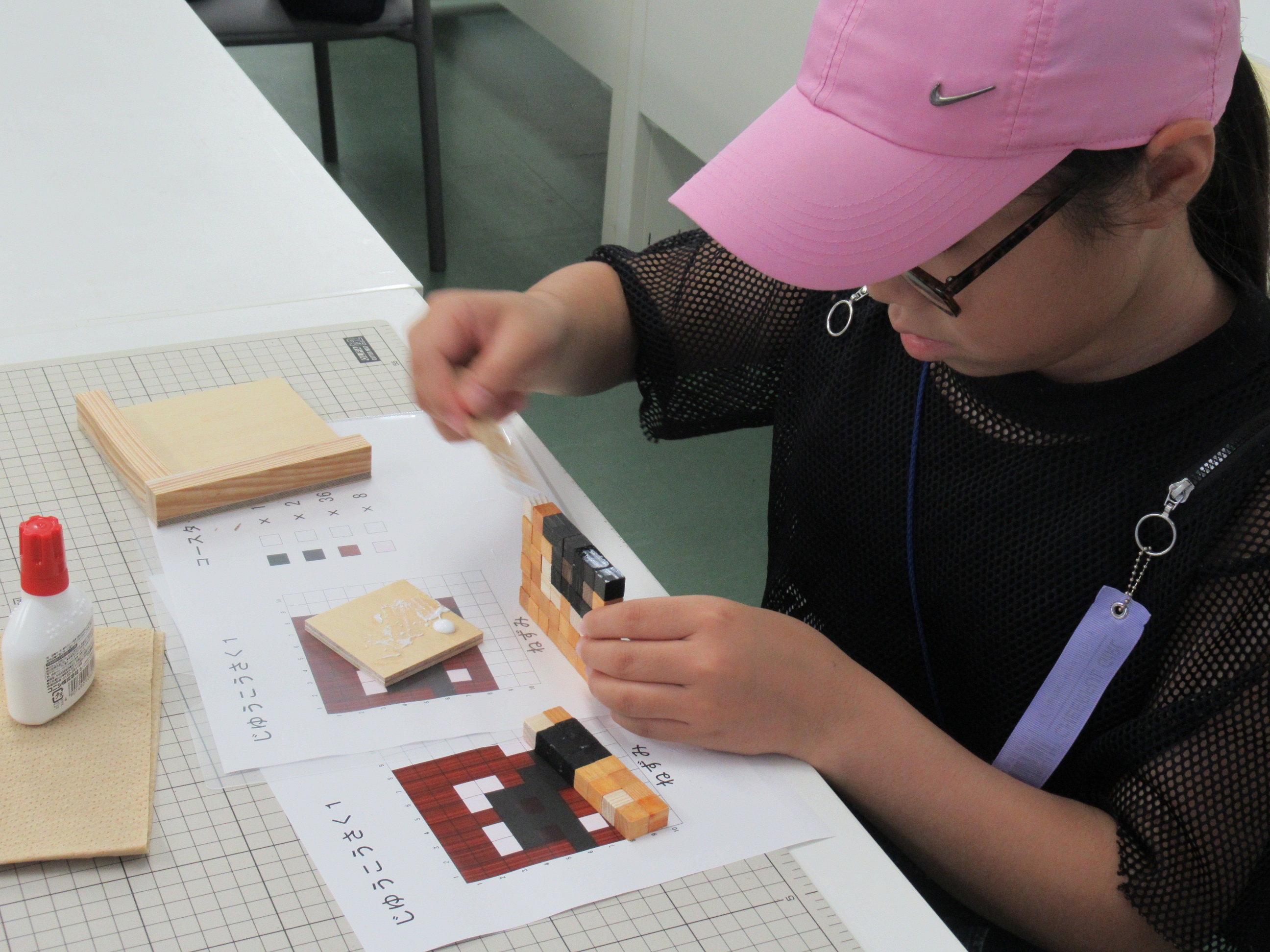 ブロックがずれないように、丁寧にボンドを塗っています。