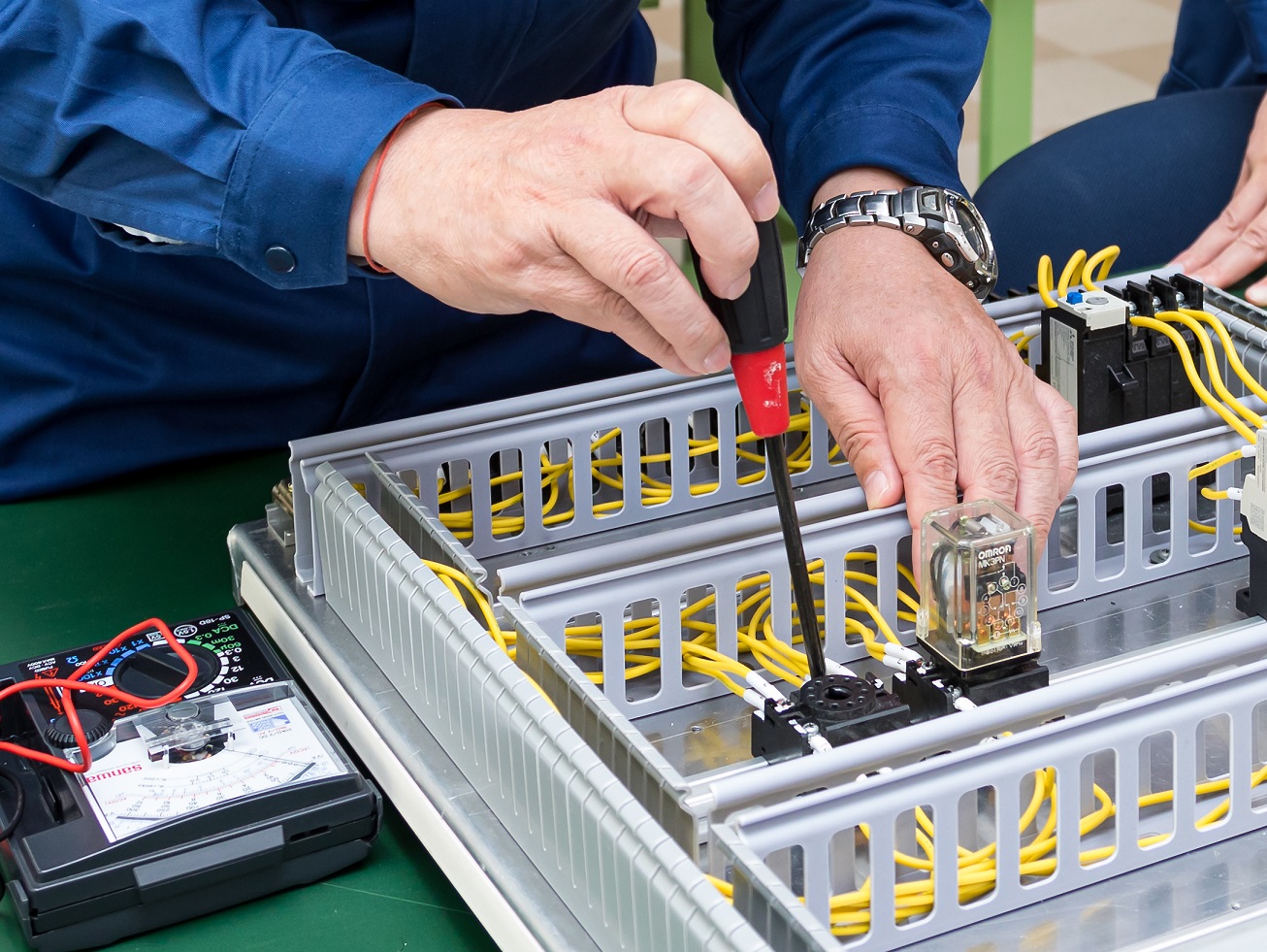 電磁接触器、電磁継電器、サーマルリレー、スイッチ、表示灯、ヒューズ、ブレーカ、各種センサ、各種負荷装置、テスタ、工具