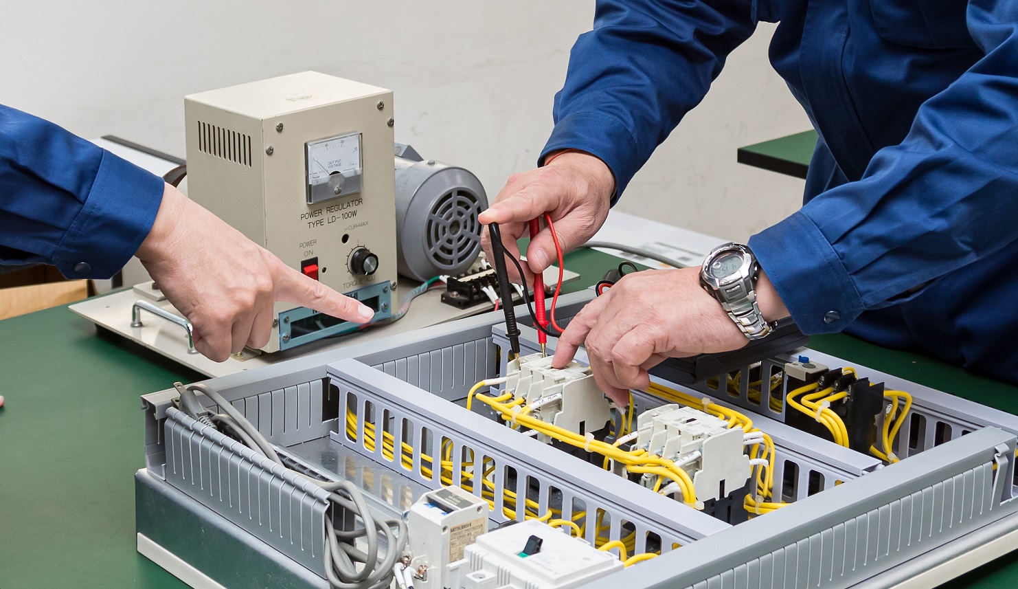 電磁接触器、電磁継電器、サーマルリレー、スイッチ、表示灯、ヒューズ、ブレーカ、三相誘導モータ、回路計(テスタ)、工具