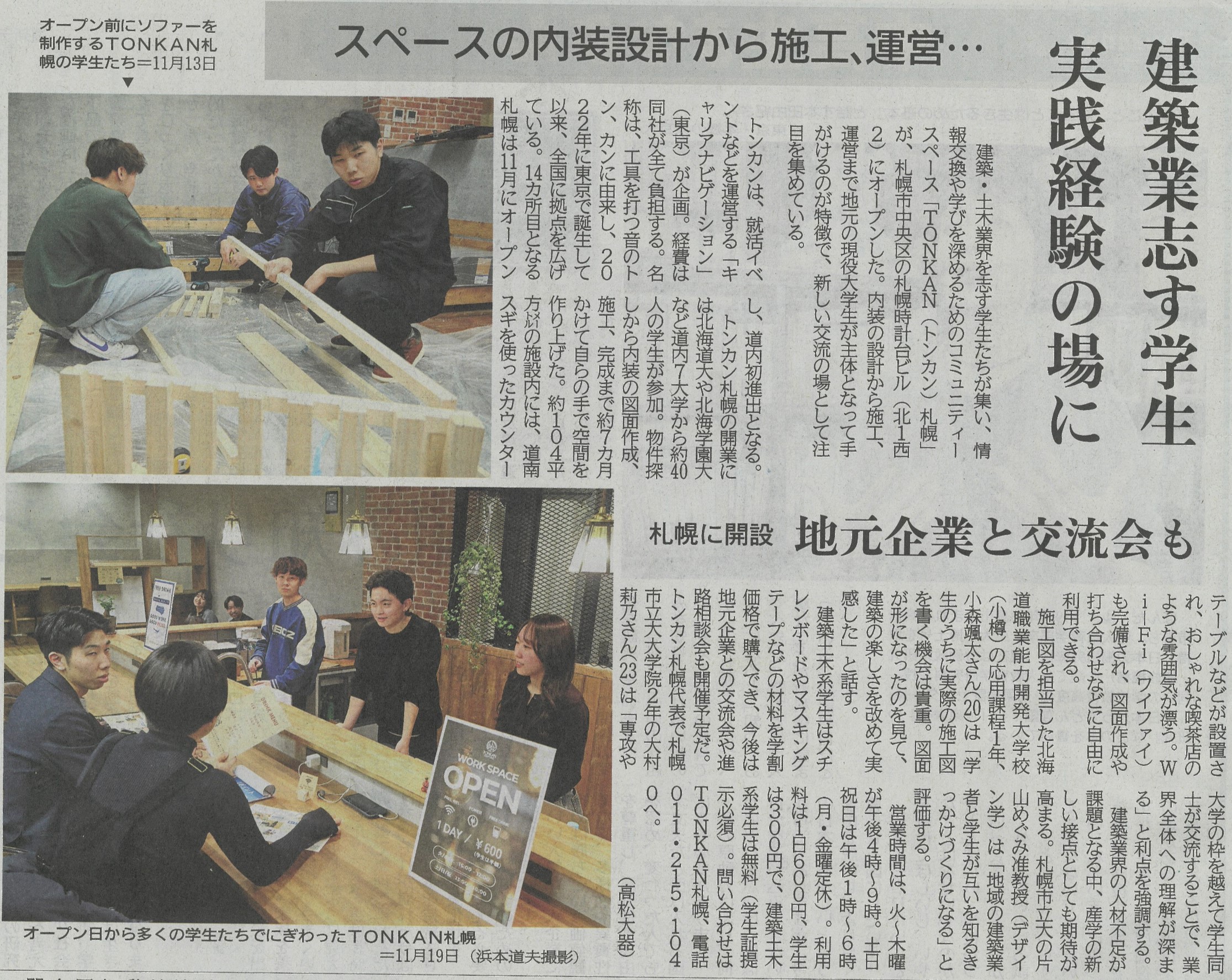 建築・土木業界を志す学生たちが集い、情報交換や学びを深めるためのコミュニティスペース「TONKAN(トンカン)札幌」が、札幌市中央区にオープンし、当校から参加している学生(建築施工システム技術科1年、小森颯太さん、板東悠河さん)の取り組みが令和7年12月4日付けの北海道新聞(朝刊)に掲載されました。