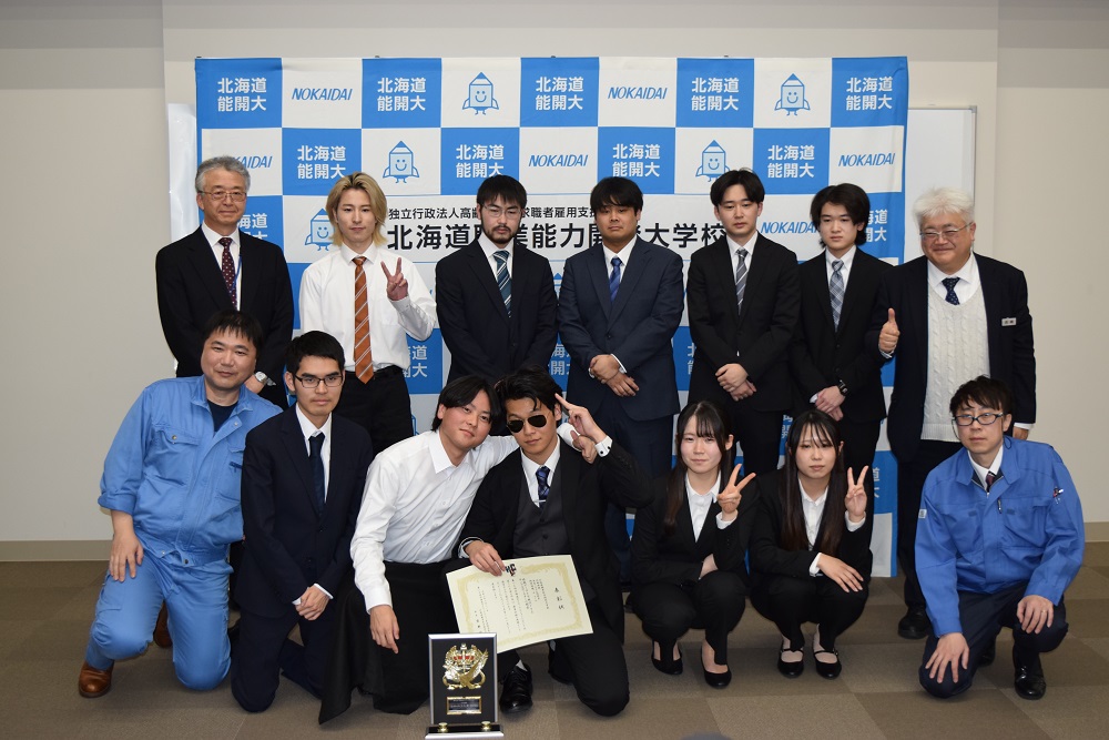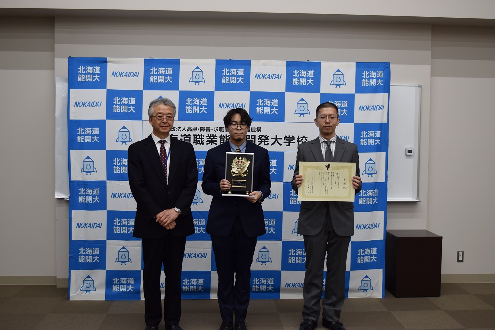 ものづくり大賞(専門課程)2025を受賞した工藤さん、柴野校長、担当指導員の集合写真