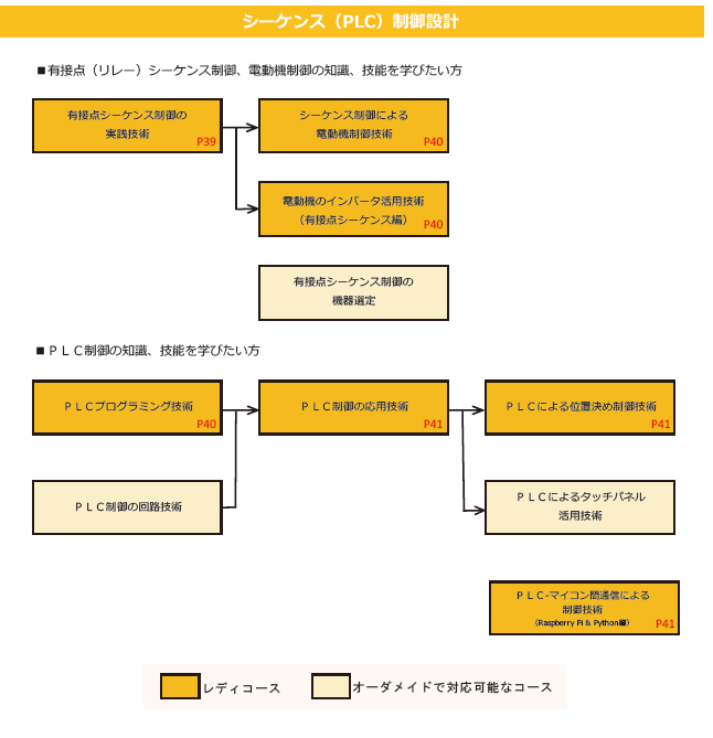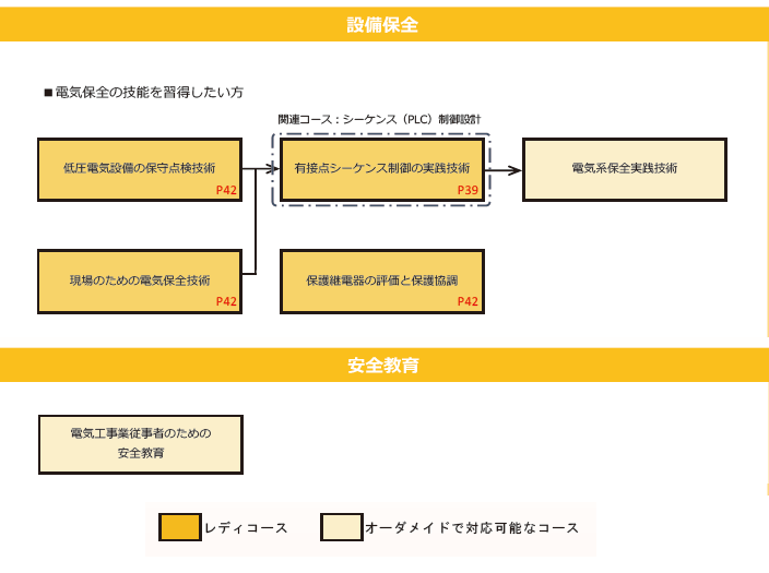 電気系セミナー体系図(R8) 令和8年度 電気系セミナー 体系図 1)セミナーを選定する際に、ご希望のコースの位置づけをご確認ください。 2)コース名右隅のPOOはR8年3月配布の「令和8年度技能・技術講習のご案内(能力開発セミナー)」のページ数に該当します。お手元に表紙が右画像のパンフレットがございましたら是非、ご参考とされてください。 3)ページ番号のないコース名は、訓練計画専門部会で承認されており、「オーダー」、「レディ追加」が可能です。ご相談をお待ちしております。 画像説明文