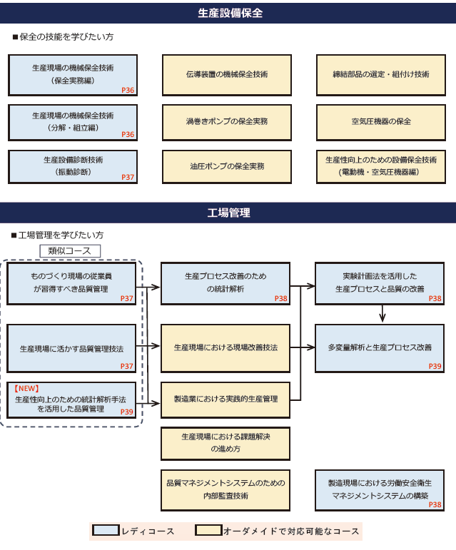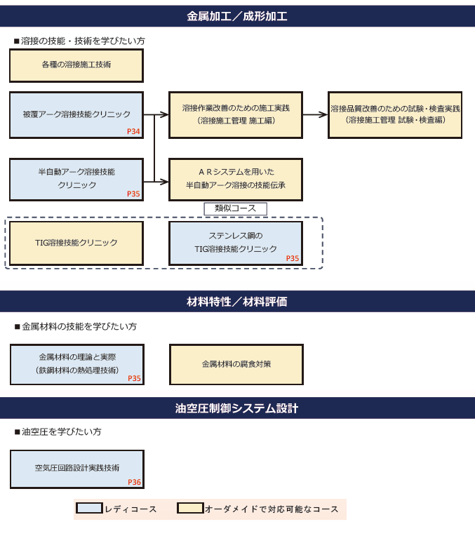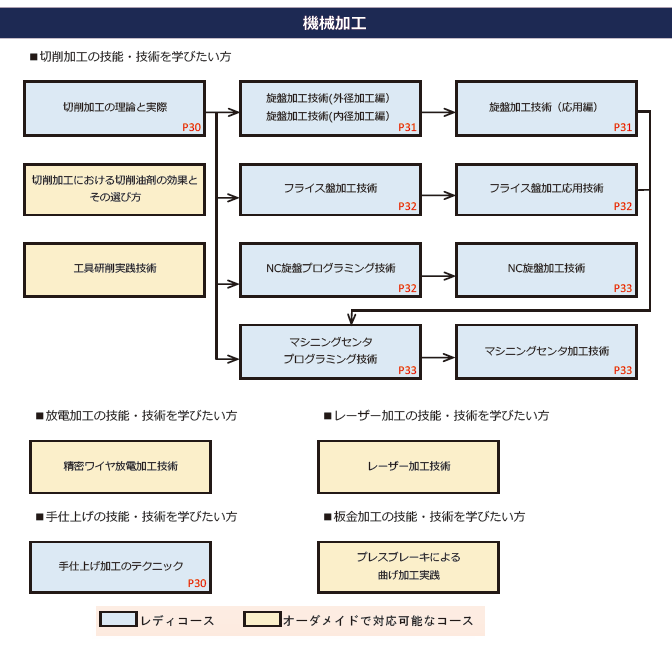 機械系セミナー体系図(R8) 令和8年度 機械系セミナー 体系図 1)セミナーを選定する際に、ご希望のコースの位置づけをご確認ください。 2)コース名右隅のPOOはR8年3月配布の「令和8年度技能・技術講習のご案内(能力開発セミナー)」のページ数に該当します。お手元に表紙が右画像のパンフレットがございましたら是非、ご参考とされてください。 3)ページ番号のないコース名は、訓練計画専門部会で承認されており、「オーダー」、「レディ追加」が可能です。ご相談をお待ちしております。 画像説明文 画像説明文 画像説明文