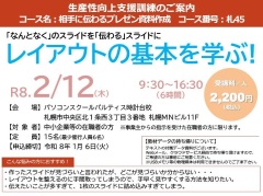 【実施日時】令和8年2月17日(火) 9:30~16:30(計6時間) 【募集定員】15名 【受講料】3,300円(税込) 【申込期限】令和8年1月8日(木) 【カリキュラム詳細(札46)】 |