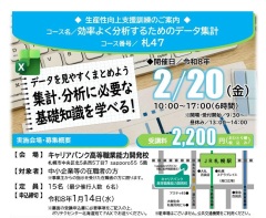 『効率よく分析するためのデータ集計』 効率よく大量のデータを分析するための、表計算ソフトを活用したデータ集計手法を習得します。 【実施日時】 令和8年3月4日(水) 9:30~16:30(計6時間) 【募集定員】15名 【受講料】2,200円(税込) 【申込期限】令和8年1月23日(金) 【カリキュラム詳細(名3)】 |