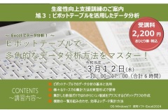 『ピボットテーブルを活用したデータ分析』 表計算ソフトのピボットテーブル機能を活用し、効率よく大量のデータを集計し、様々な視点からデータの分析を行うための手法を習得します。