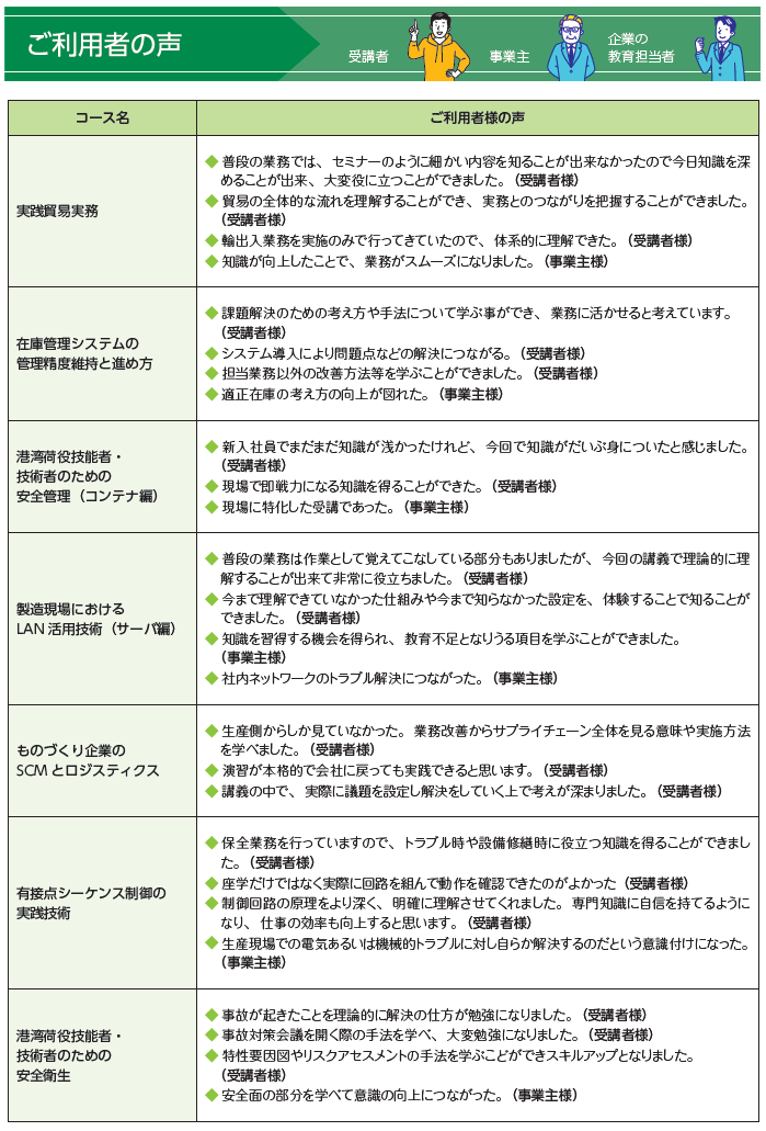 全てのコースについて、受講者およびその事業主の方に対し、コース内容に関する満足度等についてのアンケートをお願いしております。また、一部のコースについては、後日コース内容の活用状況などについても同様にお願いしております。ご協力をお願いします。