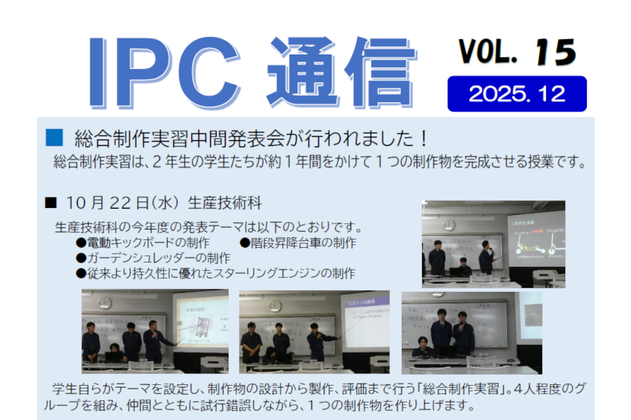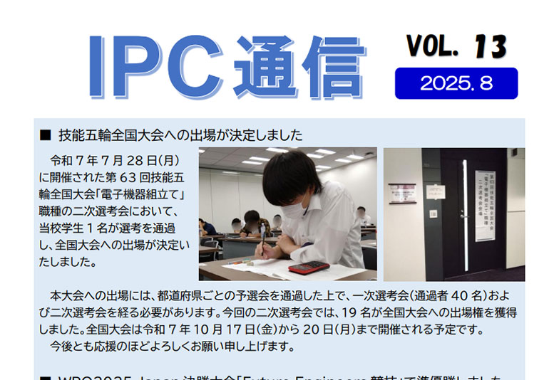 本校のオフィシャル広報紙として配信してます。各科の総合制作実習(卒業研究)の取り組み、 資格取得の取り組みなど、科のトピックを中心に紹介しています。画像をクリックするとpdf版がダウンロードできます。