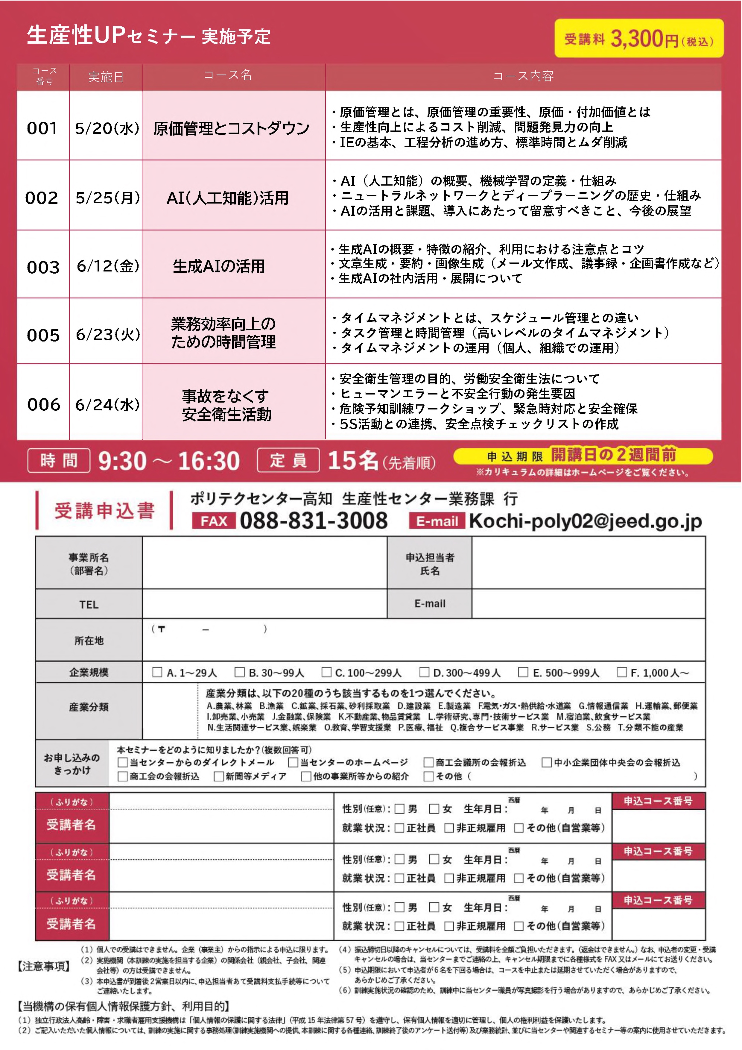受講のお申込や取消は下記の様式をダウンロードのうえ、メールまたはFAXにて生産性センター業務課あて送信してください。
