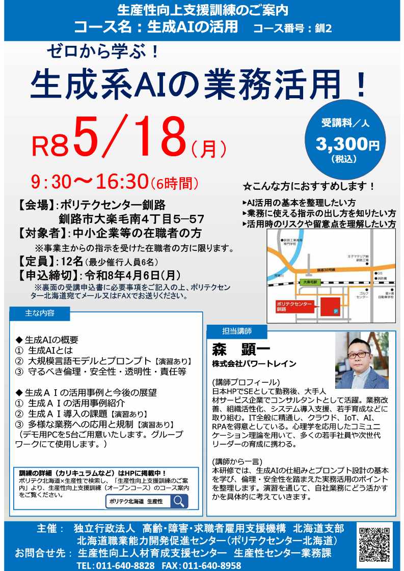 【実施日時】令和8年5月18日(月) 9:30~16:30(計6時間) 【募集定員】12名 【受講料】3,300円(税込) 【申込期限】令和8年4月6日(月) 【カリキュラム詳細(釧2)】 |