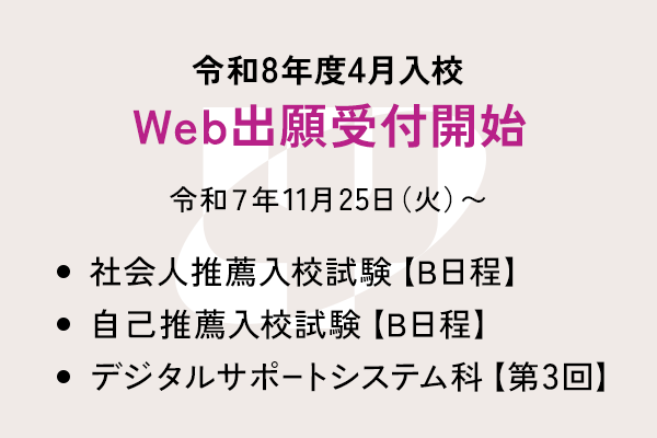 社会人推薦入校試験【B日程】、自己推薦入校試験【B日程】、デジタルサポートシステム科【第3回】の出願受付が11/25(火)から開始となります。