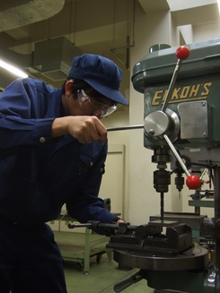 ものを正確に作るためには、平面上に書かれた機械図面から正確な形を想像する能力と、作った形が図面通りのものなのかを調べる能力が必要です。このため、はじめに機械製図基礎によって図面の読み方を学びます。次に、長さや大きさを測る測定器の取り扱い方法について学びます。さらに、”削る”、”切る”、”穴をあける”といった基本的な加工法を、ヤスリやボール盤といった比較的身近な機械や道具を用いて学びます。