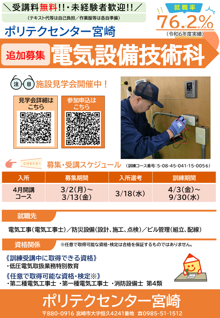 追加募集期間:令和8年3月2日(月曜日)~令和8年3月13日(金曜日)【電気設備技術科、住宅リフォーム技術科のみ】