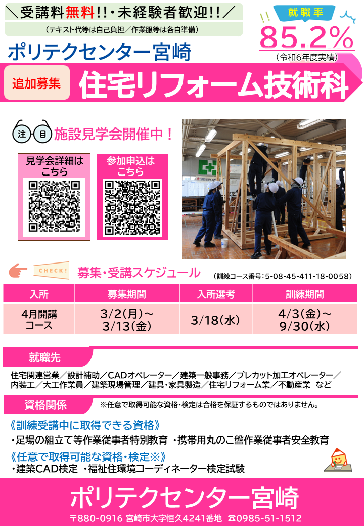 追加募集を行っています!(電気設備技術科、住宅リフォーム技術科のみ)