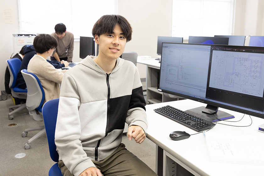 「組込みシステム」の開発にこだわり、まだまだ未完成といえる家電製品や、便利さを追求していきたいと思います。「自分の技術力で人々の日常を変える!」が僕のテーマです。圧倒的な技術の進化に貢献する技術者をイメージしながら、4年間(専門課程2年+応用課程2年)の実践的な授業・実習に挑戦していきたいと思います。