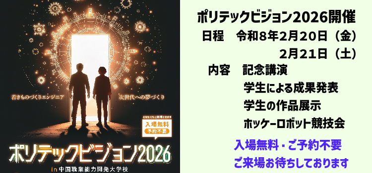 令和8年2月20日、21日(金、土)の2日間にかけまして、ポリテックビジョン2026を開催いたします。ポリテックビジョンは記念講演、本校学生による研究発表、制作物の展示を行うイベントでございます。