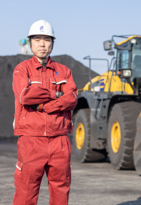 当社の荷役作業で扱う貨物はコンテナだけではなく、梱包されていない状態の石炭や粉末等の「ばら貨物」と呼ばれるものもあります。この「ばら貨物」を大型のクレーンバケットがすくいやすくなるよう重機を使って運搬したり、貨物船のバランスを考慮して積荷を整えたりするなどのアシストをする船内沿岸業務を担当しています。