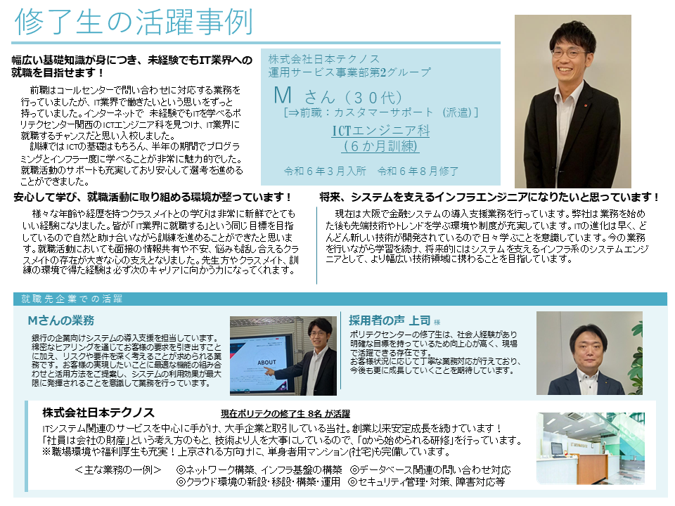 株式会社日本テクノスのM氏(ICTエンジニア科 令和6年8月修了生)と同社採用御担当者に、ポリテクセンター関西で実施した訓練について感想をお伺いしました。
