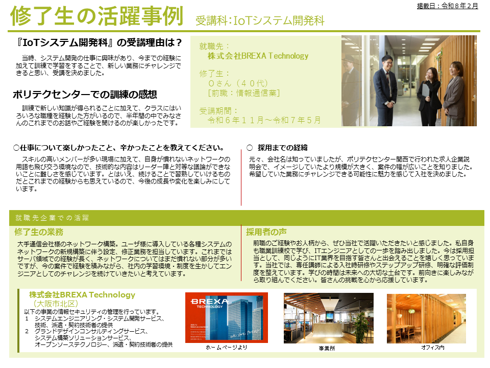 株式会社BREXA TechnologyのO氏(IoTシステム開発科 令和7年5月修了生)と同社採用御担当者に、ポリテクセンター関西で実施した訓練について感想をお伺いしました。