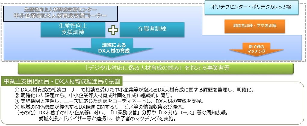 生産性向上人材育成支援センターでは、中小企業等のDX(デジタルトランスフォーメーション)人材育成を推進するため、令和4年度から「中小企業等DX人材育成支援コーナー」を設置しています。