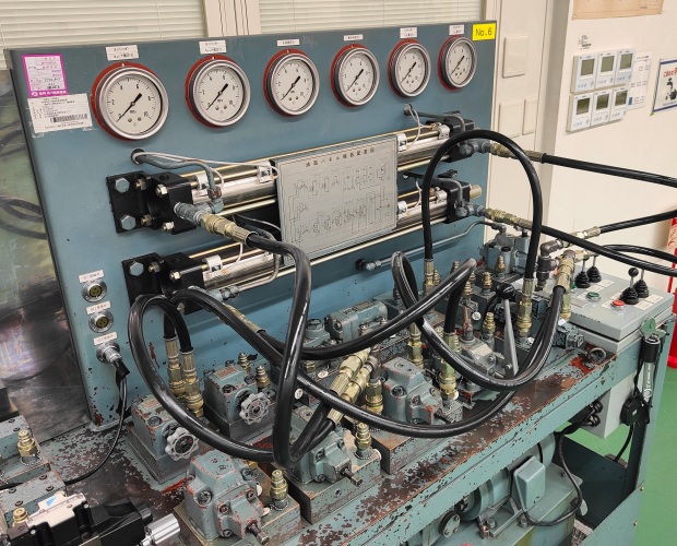 油圧システムの概要、油圧機器の構造、油圧実用回路の作成と動作評価に至るまで、実習と学科を通して習得します。