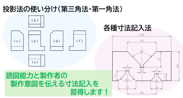 ※JIS機械製図に則った線の種類、各種投影図、寸法記入を主としたコースです。