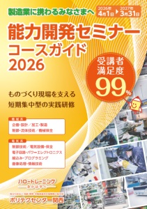 ※本書に記載されている会社名または製品名は、各社の商標または登録商標です。 2026年4.1 ▶2027年3.31 能力開発セミナー コースガイド2026 CONTENTS ●ポリテクセンター関西の事業の紹介 P1 ●目 次 P2 ●ポリテクセンター関西の施設・設備 P3 ●受講のご案内~お申し込みから受講までの流れ~ P4~P5 ●よくある質問と回答 P6 ●ホームページによるセミナー情報のご案内 P7 ●中小企業支援制度のご案内 P8~P9 ●コース体系 P10~P15 ●月別コース一覧表 P16~P21 ●コース内容 P22~P77 ■機械系 P22~P42 製品企画/開発/デザイン P22~P25 機械設計/製図 P26~P31 機械設計(CAE 活用) P31 成形/金型 P32~P33 機械加工技術 P33~P36 NC加工技術 P36~P37 溶接・板金加工技術 P37~P38 油空圧技術 P38~P40 材料利用技術 P40 測定技術 P41~P42 機械保全 P42 ■生産計画/生産管理 P43~P47 ■電気・電子系 P48~P77 制御機器選定技術 P48 有接点シーケンス技術 P48~P49 モータ制御技術 P49 PLC制御技術 P50~P56 ロボット制御技術 P57 電気系保全技術 P58 フィードバック制御技術 P59 画像処理技術 P59~P60 低圧電気設備技術 P60~P61 高圧電気設備技術 P61~P62 空調設備技術 P63 環境・省エネルギー技術 P63~P64 電子回路技術 P64~P68 パワーエレクトロニクス技術 P69 C 言語プログラミング・マイコン制御関連技術 P70~P73 Linux 組込み・制御関連技術 P73~P75 生産情報システム・Android 関連技術 P75~P77 ●ポリテクセンター関西で実施する建築系コースのご案内 P78 ●オーダーメイドセミナーのご案内 P79 ●生産性向上支援訓練のご案内 P80~P81 ●ポリテクセンター関西施設利用のご案内 P82~P83 ●技能・技術を持った人材確保をお考えなら P84~P85 ●実施施設のご案内 P86 ●近畿ポリテクカレッジ設定コースのご案内P87~P111 ●事業主推薦制度のご案内 P112 ●高度ポリテクセンターのご案内 P113 ●受講申込書 P114 ●キャンセル・コース移動・受講者変更届 P115 2