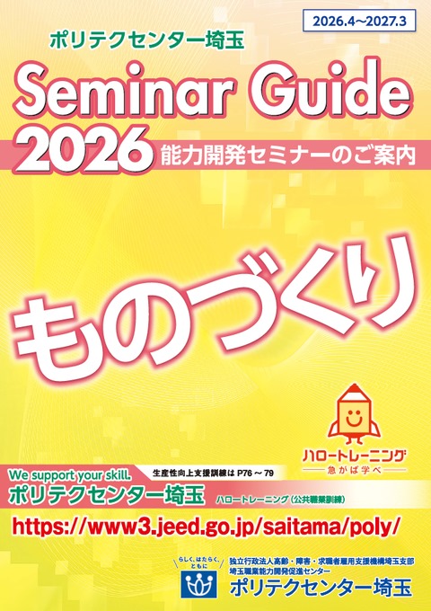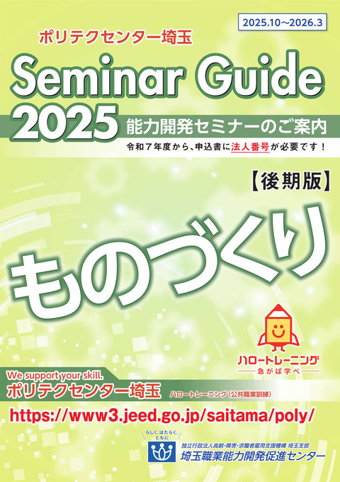 ポリテクセンター埼玉では、在職者の方を対象に、職業に必要な技術・技能・知識の習得を目的とした短期間の職業訓練(能力開発セミナー)を開講しています。従業員の計画的な人材育成やキャリア形成、自己啓発にお役立てください。