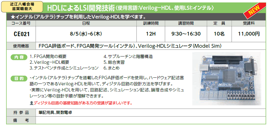 8/5(水)・6(木) | 受付中 | 11,000円 | インテル(アルテラ)チップを利用したVerilog-HDLを学べます。 | ||