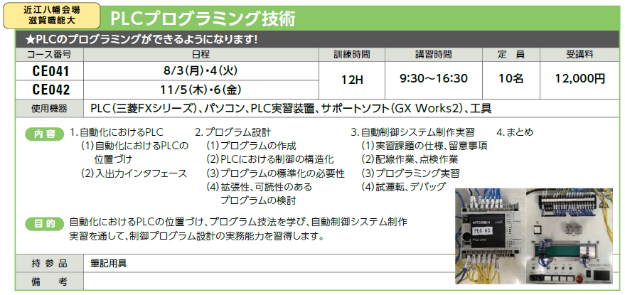 | CE041 | PLCプログラミング技術 | 8/3(月)・4(火) | 受付中 | 12,000円 | PLCのプログラミングができるようになります! | 三菱 FX、GX Works2 | |