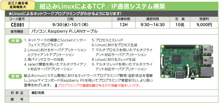 | CE081 | 組込みLinuxによるTCP/IP通信システム構築 | 9/30(水)・10/1(木) | 受付中 | 9,000円 | Linuxによるネットワークプログラミングがわかるようになります! | Raspberry Pi | |