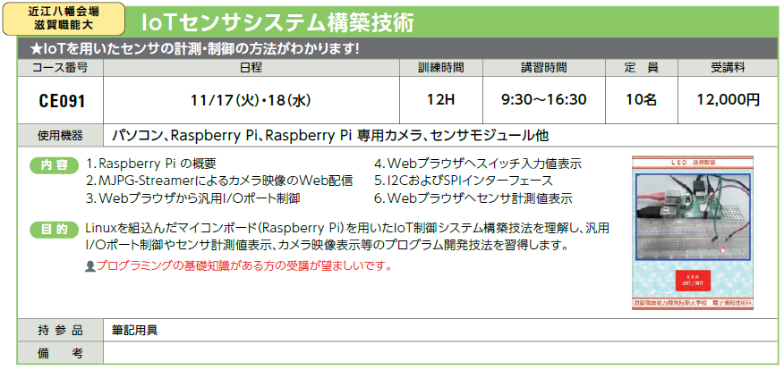 | IoT/AI技術 | CE091 | IoTセンサシステム構築技術 | 11/17(火)・18(水) | 受付中 | 12,000円 | IoTを用いたセンサの計測・制御の方法がわかります! | Raspberry Pi |