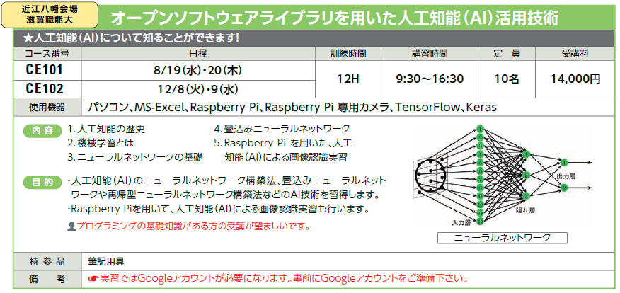 | CE101 | オープンソフトウェアライブラリを用いた 人工知能(AI)活用技術 |