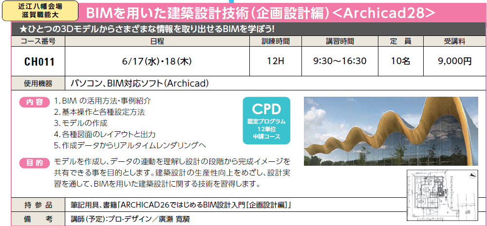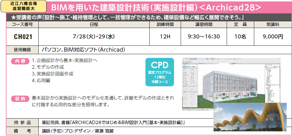 | CH021 | BIMを用いた建築設計技術(実施設計編)<Archicad28> | 7/28(火)・29(水) | 受付中 | 9,000円 | 受講者の声「設計~施工・維持管理として、一括管理ができるため、建築設備など幅広く展開できそう」 | Archicad28 | |