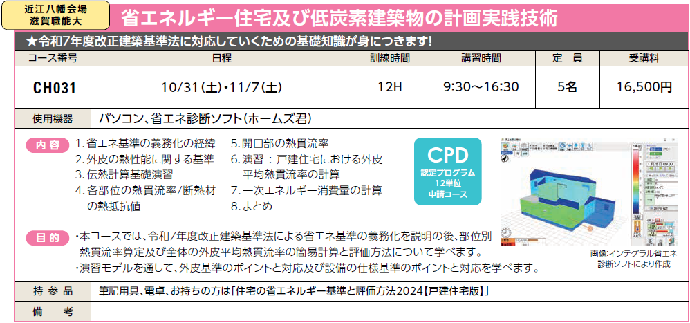 | CH031 | 省エネルギー住宅及び低炭素建築物の計画実践技術 | 10/31(土)・11/7(土) | 受付中 | 16,500円 | 令和7年度改正建築基準法に対応していくための基礎知識が身につきます! | ホームズ君 | |