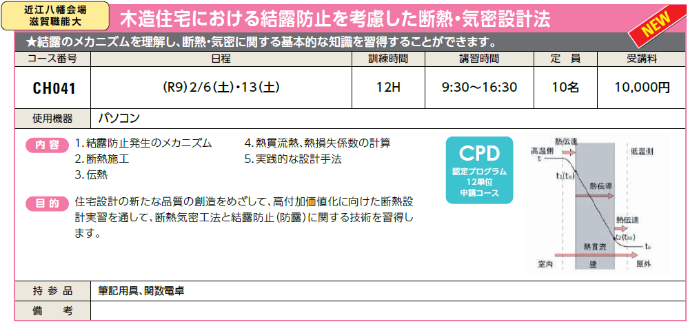 (R9) 2/6(土)・13(土) | 受付中 | 10,000円 | 結露のメカニズムを理解し、断熱・気密に関する基本的な知識を習得できます。 | ||