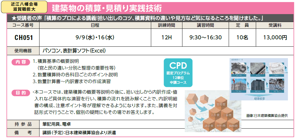 | CH051 | 建築物の積算・見積り実践技術 | 9/9(水)・16(水) | 受付中 | 13,000円 | 受講者の声「積算のプロによる講義!拾い出しのコツ、積算資料の違いや見方など気になるところを聞けました」 | ||