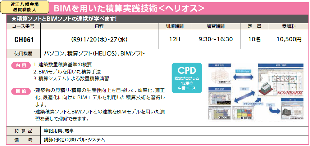 | CH061 | BIMを用いた積算実践技術 <ヘリオス> | (R9) 1/20(水)・27(水) | 受付中 | 10,500円 | 積算ソフトとBIMソフトの連携が学べます! | ヘリオス、Revit | |